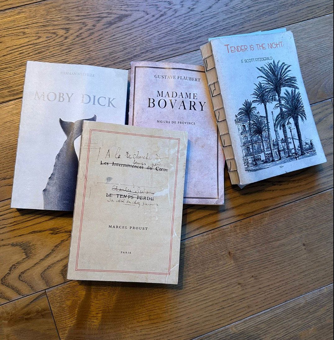 Elle tuttuklarım için defterlerim vardır. Bu aşağıdakiler benim zihnimin güzel yerleri için tuttuğum listelerle dolu defterler, kapakları roman kapaklarından. Moby Dick’te düşündüğüm, merak ettiğim şeyler için, À la recherche du temps perdu’da şu an üzerinde çalıştığım değil de bir sonraki roman için, Madame Bovary’de şu an üzerimde çalıştığım roman için, Tender is the Night’ta da Poetika için listelerim var.